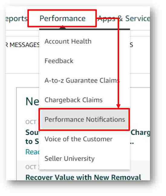 转到你的亚马逊卖家中心,单击绩效菜单并从下拉菜单中选择绩效通知。