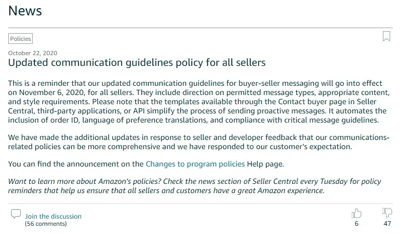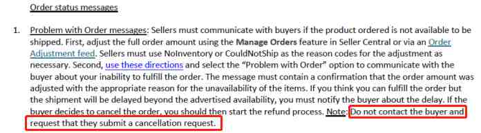 亚马逊后台发邮件通知卖家,新版的交流指南政策将于11月6日正式实施。新政策中针对卖家和买家的联系规则进行明显改动。同时对允许发送的消息类型和内容进行了更新,重点都酷仔都列出来了,笔记安排上!在新版交流指南中明确提出:不允许卖家联系买家以商品缺货等理由要求买家发起取消订单申请!此次最大的改动,也是卖家最容易踩到的点!在此之前,卖家因为缺货等原因发邮件请求买家取消订单是常规操作。这关系到两个店铺绩效,一个是“发货前取消率”,是指由发货前由卖家取消订单;另一个是“迟发率”,指产品无法在规定期间内发货。当这两个订单缺陷率超过目标数值时,卖家店铺会有被冻结的风险。因此,为了避免发货前取消或无法在规定时间内发货被记入店铺绩效,写信要求买家取消订单是最理想的方法。但是11月6日之后,卖家不能再这样操作了,会违反交流指南,严重的将被移除销售权。解决方法在新版指南中有提出,当卖家因为缺货或是其他原因无法为订单配送产品时,应按以下操作:1. 选择 “No Inventory”或“CouldNotShip”作为原因来调整订单;