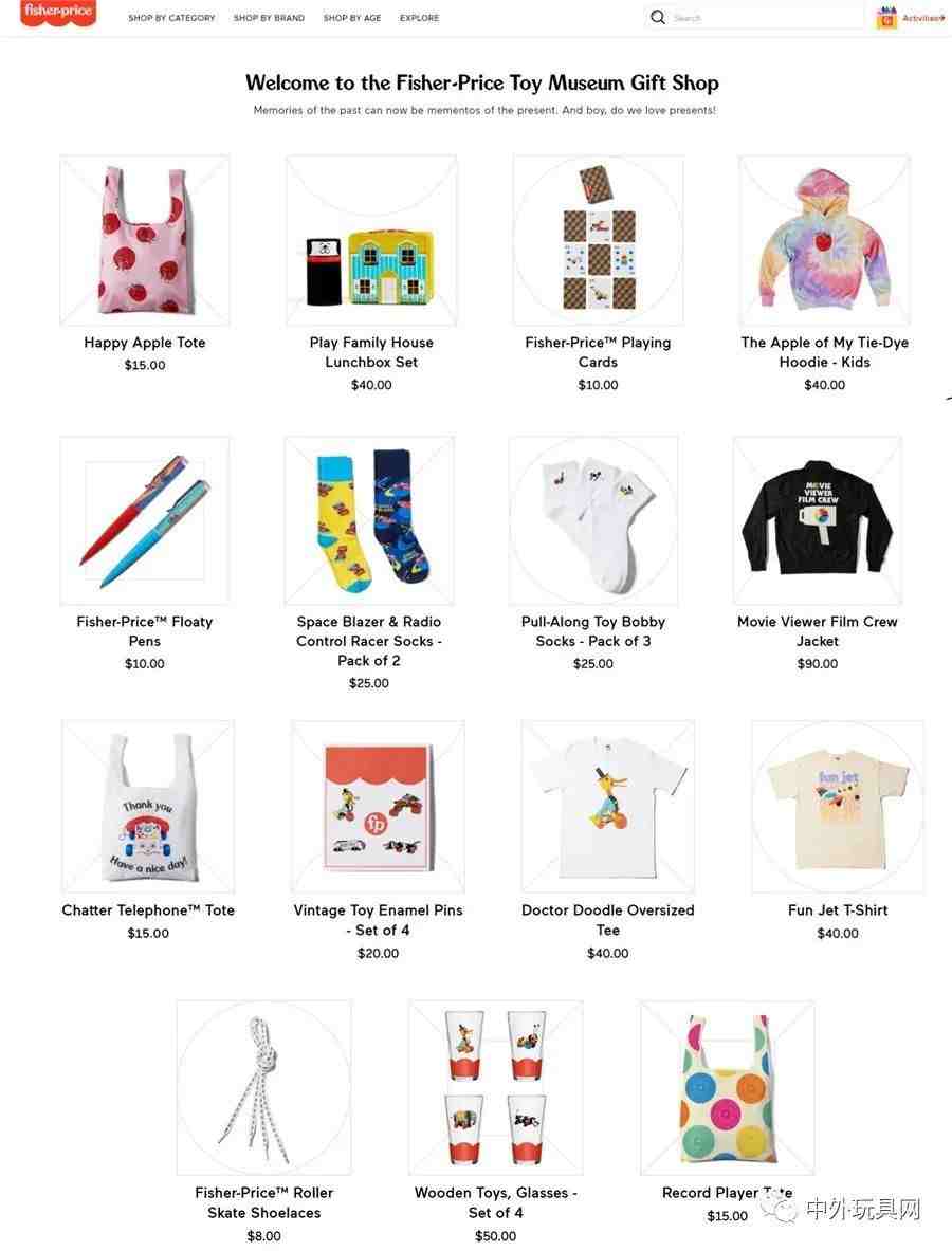 纪念产品可在网上数字商店购买,包含15种产品,限量出售,售价在10美元至90美元之间,其中包括印有费雪最早产品之一的Doodle博士的t恤,溜冰鞋的鞋带,以及印有“Play Family House”的午餐盒等等…