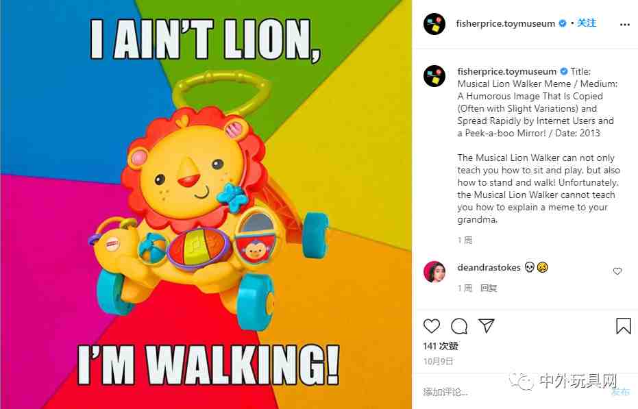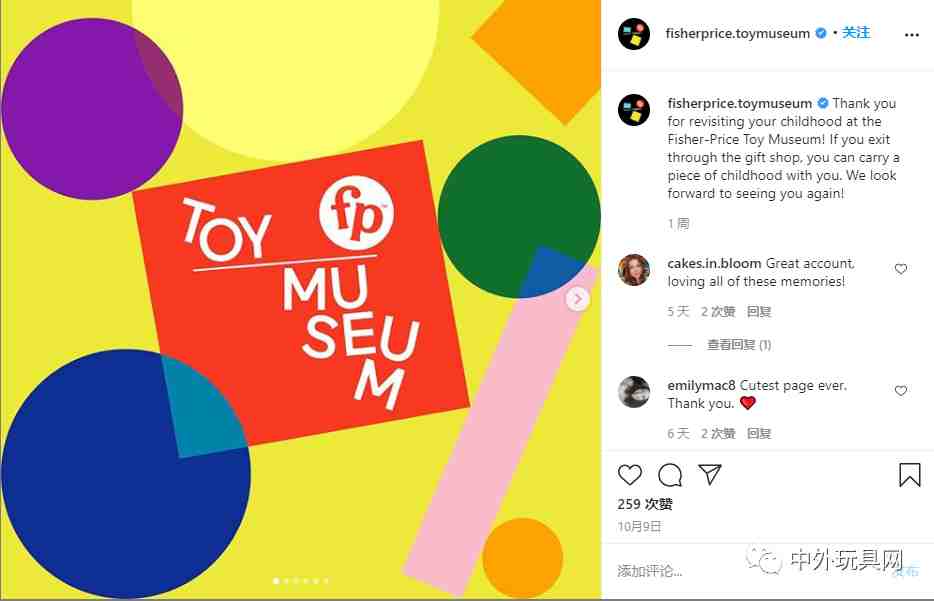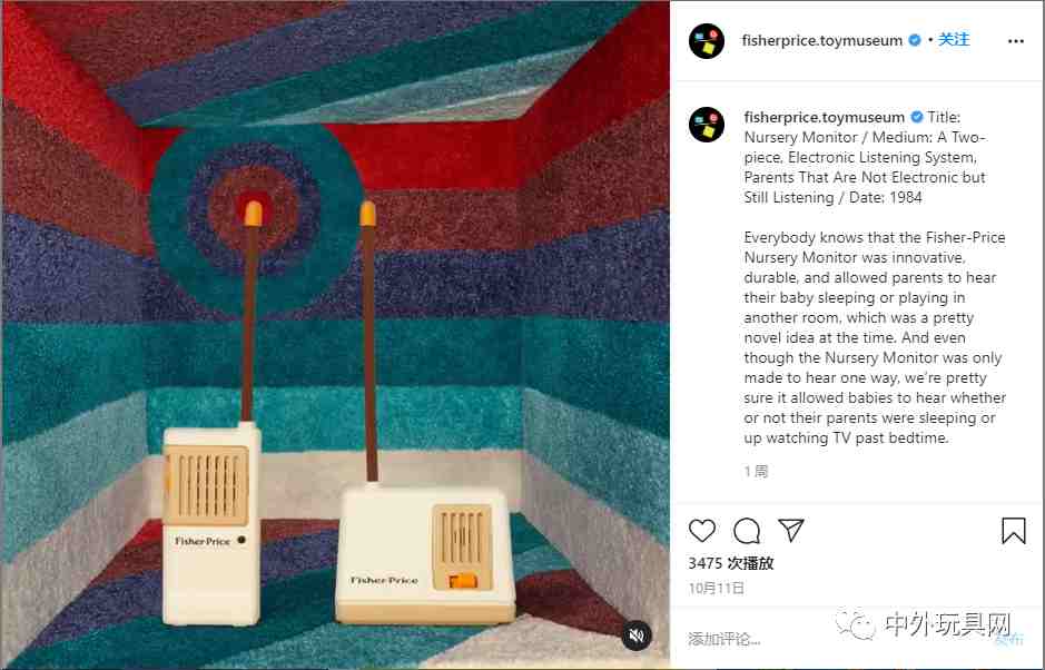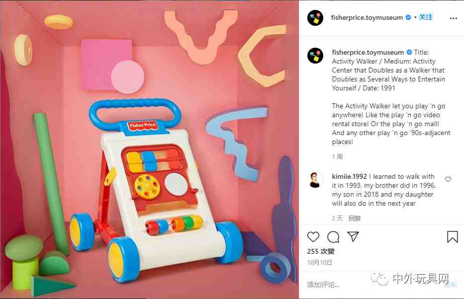 简单来说,就是在INS上通过发布图片和视频的方式,带着粉丝一起回顾、重温费雪这90年间的若干经典玩具,虽然形式很简单,但图片和视频是仿照布展标准,图片与视频的色彩、画面都经过精心设计,真的仿佛就在展览现场一样,可以看出品牌方还是蛮用心的~