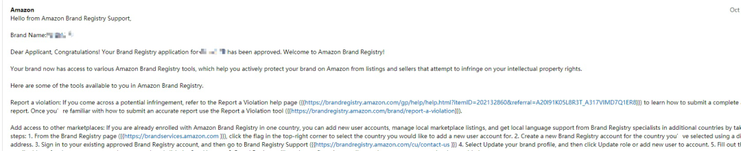 4.完成第三步顺利的话大概72小时内就能收到品牌成功备案的邮件,如下图: