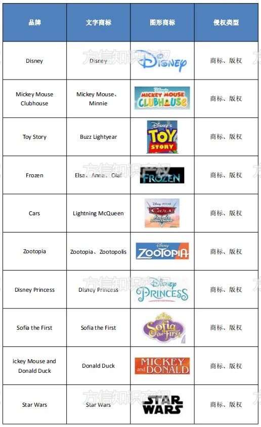 在侵权品牌科普之前,小信先给大家更正一个误区。很多卖家认为维权律所几乎都是美国的,所以其他国家的品牌就不会涉及,这个想法是错误的。各位卖家在各国各平台都需要注意知识产权的问题,避免侵权!接下来,小信给大家科普近期维权高频发生的三个品牌。 众所周知, Disney 是著名的 “版权狂魔” 。Disney 对维权非常重视,从不网开一面!Disney 品牌善于通过著作权来维护自身的 IP ,他们之所以能够发起这么多次维权之战并且 “大获全胜” ,就是因为该品牌为保护自身 IP ,打造了一张严密的知识产权网。 关于迪士尼,小信分享一个著名的段子:假如有一天你落到一个孤岛,想要获救最好办法,就是在岛上画一个巨大的米老鼠,迪士尼的法务部门将以最快的速度赶来,起诉你。那么 “维权狂魔” 的迪士尼对版权有着怎样的执着呢?主要有三点:1、战线长;2、范围广;3、小人物也逃不掉。 所谓战线长和范围广,几乎每年迪士尼都会推陈出新,让新的卡通形象延续迪士尼梦幻的魅力。比如近几年成为文化现象的《冰雪奇缘》,此外通过收购其他公司,进一步扩大了迪士尼的大家族,增加了新的大 IP ,比如受跨境电商欢迎的《星球大战》等,同时不断维持往日明星卡通形象,如迪士尼的公主们,米老鼠等。 而且每部作品 “可可爱爱,没有脑壳” 的小人物形象也是侵权陷阱!近年具有代表性的是《冰雪奇缘》的雪人 “雪宝” ,《玩具总动员》里各种小玩具角色等,也是防不胜防。 (热门迪士尼卡通形象) 本次被起诉侵权的主要有以下文字商标及图片商标: 也即意味着,除了版权方面可以保护相关卡通形象,迪士尼还在商标领域布局完善,不仅仅注册了诸如 “ Disney ”、“ Frozen ”、“ TOYSTORY ”等文字设计商标,甚至相关卡通形象也注册为图形商标。 可以看得出, Disney 对品牌下各种卡通人物形象以及名称都进行了知识产权的保护。所以提醒各位卖家,无论是标题、Listing,还是自身产品都不要轻易使用和该品牌相关的文字及图片,更不要将品牌的火爆形象印刷在产品上,避免发生侵权案件。 初音未来是是 2007 年 8 月 31 日由 CRYPTONFUTUREMEDIA 以 Yamaha 的 VOCALOID 系列语音合成程序为基础开发的音源库,音源数据资料采样于日本声优藤田咲。因可爱的形象和甜美的歌喉,在全球斩获6亿多粉丝,可谓是超高的人气。近年来,初音未来成为各大厂商的“宠儿”,代言、授权产品种类从互联网、时装、汽车到生活用品,同时也伴随着侵权风险。 目前该品牌主要的起诉的是商标侵权。作为二次元的宠儿的初音未来,周边产品层出不穷,该品牌方的版权意识也十分强烈,注册了很多初音未来相关的商标且覆盖品类十分广。 所以和初音未来相关的商标,卖家们避免使用在自己的产品上,或是出现在描述中。另外需要特别注意的是,初音未来的少女形象非常深入人心,比起商标更容易在产品上出现相关形象,故有关的图片形象也不要随意使用,避免侵权。 近期紧随 UGG 之后,另一热门鞋款也成为了侵权重点。 crocs(卡骆驰)是一家总部位于美国科罗拉多州的鞋履设计、生产及零售商,以 crocs 品牌于市场上推出男装、女装及童装的舒适鞋款。创立于 2002 年, crocs 鞋子最初的产品市场定位是帆船运动和户外运动者,后来因为它穿着舒适而受到不同消费者的青睐。其中,洞洞鞋就是该品牌十分出名的产品之一,深受买家们的喜爱,是大名鼎鼎的洞洞鞋鼻祖。 该品牌应该是商标侵权案件,注意该品牌的文字商标及图形商标: Crocs 、CrocsLittles 、Literide 以及经典的鳄鱼图案等。小信通过目前的侵权案件来看,暂时没有涉及到图片版权和设计专利的侵权问题,当然也不排除有其他侵权问题。 卖家们需要的是不要打擦边球,自己产品是洞洞鞋并在标题描述里使用 Crocs 相关词组,都有可能产生侵权风险! 此外,近期,鞋子品牌(匡威、UGG等)的维权频发,希望卖家们提高警惕!鞋子由于其品类特殊性,导致经常发生图形商标侵权,很多图形商标印制在鞋子或者是鞋子的样式,这种类型的图形商标要特别小心规避。 就 crocs 而言,文字商标,鳄鱼图形商标切不可用,而擦边行为也有侵权风险,旺季风险高,且行且珍惜。
