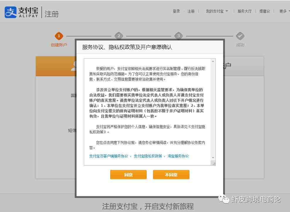 找到注册按钮,点击注册,会跳出来服务协议,点击同意然后选择企业支付宝就可以了,按照要求填写电子邮箱