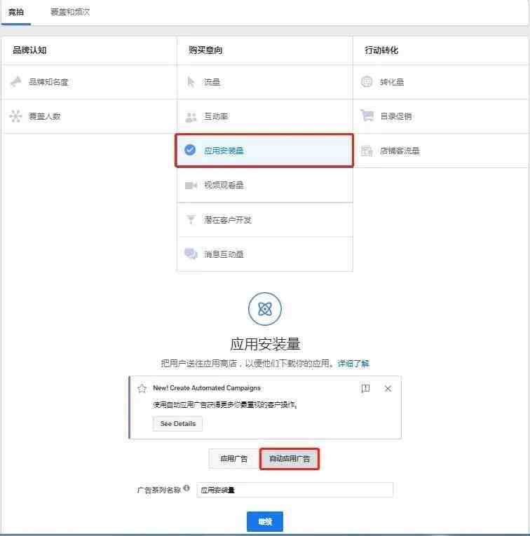 操作方法:广告目标选择应用安装量,选择自动应用广告。
