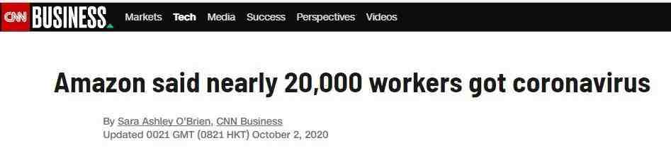 在劳工组织、健康专家、政客以及媒体等多重因素的施压下,亚马逊公司终于在当地时间周四,首次公布了关于员工感染新冠的具体情况。数据显示,今年3月1日到9月19日期间,亚马逊公司总计有19816名美国员工确认,或推定感染新冠,这占到其约137万名员工总数的1.44%。
