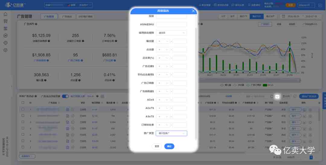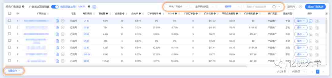 系统提供了多种筛选条件方便用户快速查找对应的广告活动,同时支持批量操作。