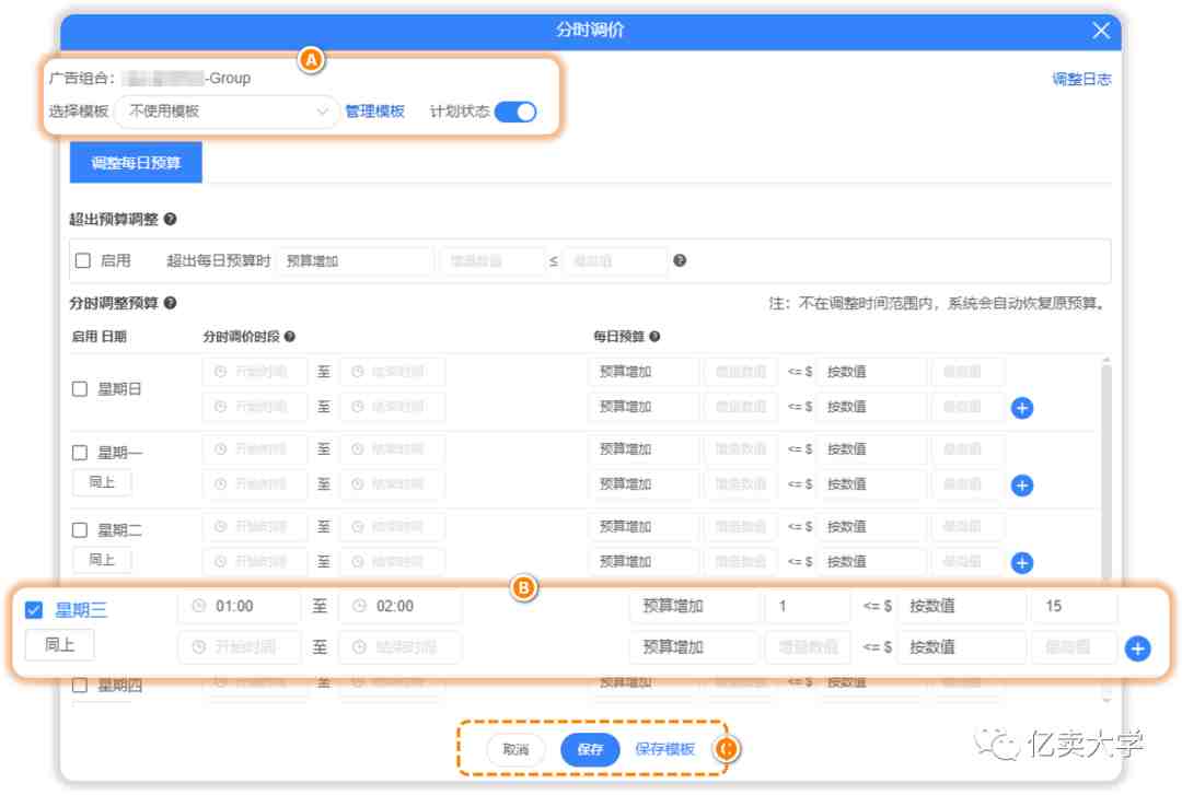 用户在设置广告顶级预算后,还可通过点击右侧的“分时调价”按钮,快速进入分时调价功能,设置超预算调整规则或分时预算,提高预算效益。