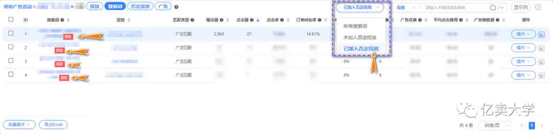 用户可直接在搜索词面板进行否定。筛选“未加入否定投放”可查看未否定的搜索词,数据会更清晰。