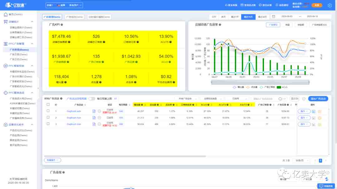 亿数通的广告管理功能可协助大家轻松查看以上必看的广告数据,直观高效地了解店铺整体概况。
