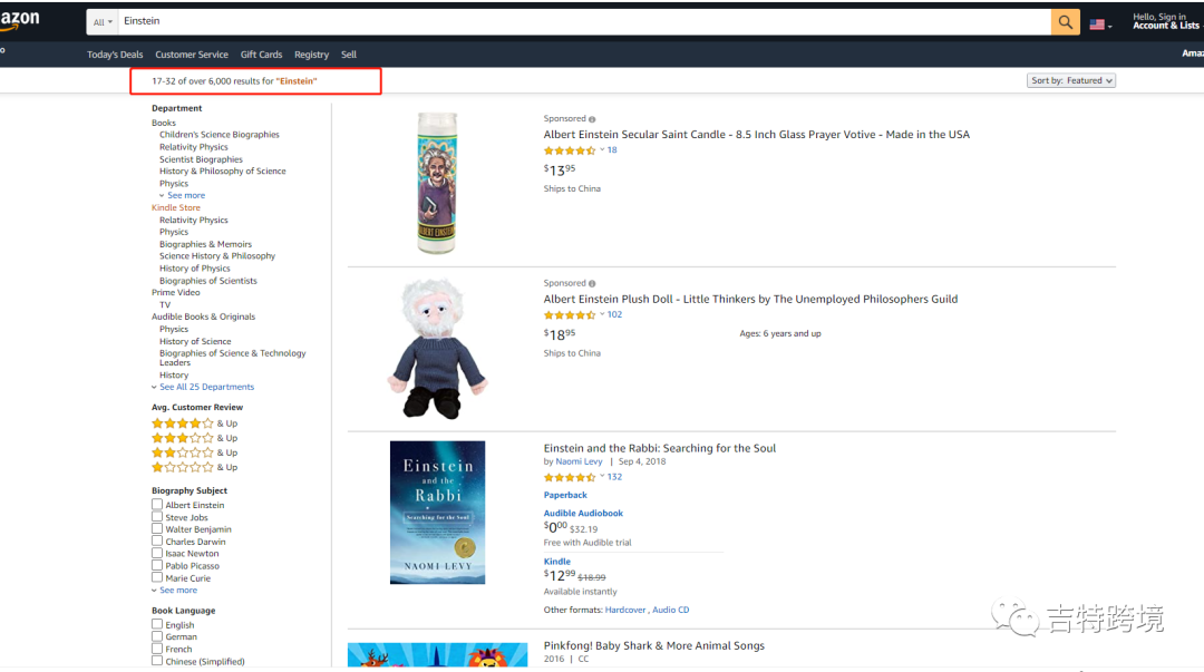 我们随机在亚马逊上搜索“Einstein”,相关产品就有6000多个:玩偶、杯子、袜子、T恤,涉及的类目,卖家范围相当广。