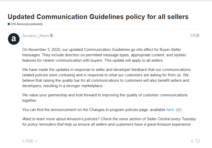 这一政策发出,意味着亚马逊在沟通方面给卖家们打开了一扇窗户,对卖家来说真的是一则喜报了。