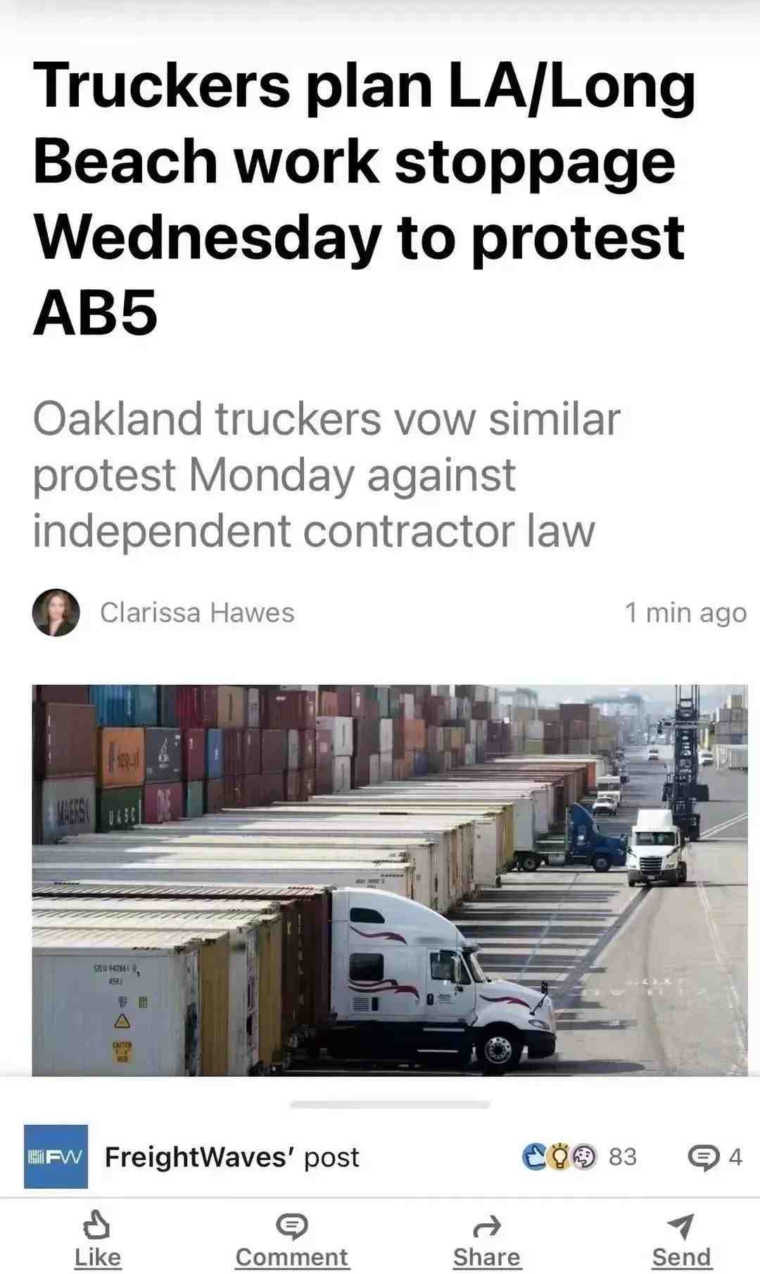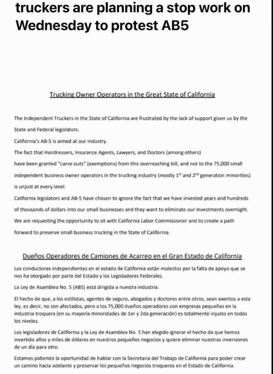 据悉,原因是抗议一项名为“AB5”,涉及卡车运输行业、且有争议的加州法律。这项名为AB5的法案旨在限制独立承包人( independent contractor)的工作,并在很大程度上把他们归为雇员司机、而非官方认可的运输承包人。