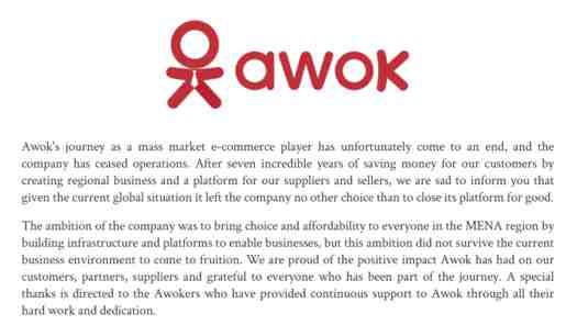 Awok刚刚在其首页上发布的声明中引用了当前的全球不稳定的局势作为关闭的原因。说该公司别无选择,不得不永久关闭该平台。
