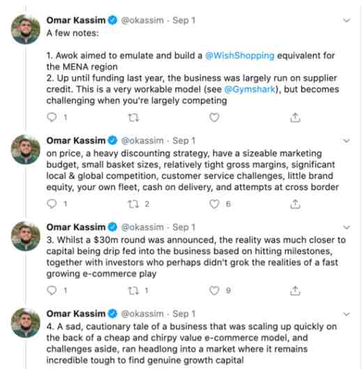 当时,以跨境中国货物为主的Awok宣称要拿这笔投资来进军沙特市场,同时提升用户体验。也宣布了对巴基斯坦等其他市场的长期扩张展望。但中东创投圈有影响力的人物Omar Kassim在Twitter上表示,Awok虽然计划建立一个中东版的Wish,而且直到去年融资,一直是靠卖家的账期维持和发展。这个模式虽然以前可能可行,但是在一个竞争激烈环境下,高获客成本、低客单价、自营物流的成本等等大大提到了Awok运营的挑战。