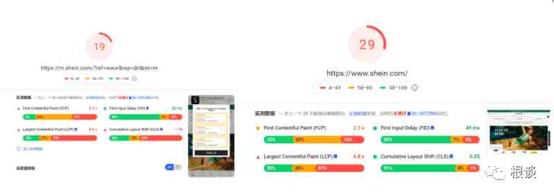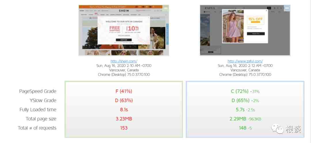 通过第三方的工具使用了加拿服务器大节点检测shein全球站的打开速度,由于SHEIN首页以图片为主,有各种轮播banner大图,CSS样式丰富,JS代码请求数比较多,导致单个页面较大,影响了网站的加载速度,pagespeed实际得分很低,远低于76%的行业平均水平。相比竞品ZAFUL还是优化空间很大,同时对比google的page speed insight桌面和移动端都加载比较慢