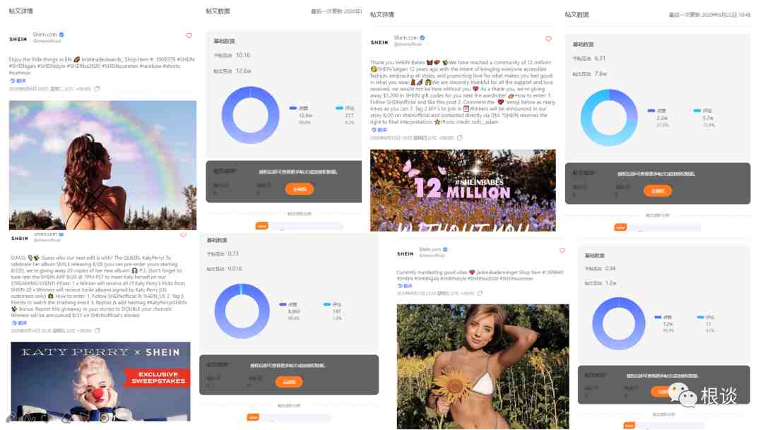 SHEIN帖子以网红图为主,通过给网红寄送衣服合作的形式获得网红图,同时网红会艾特SHEIN官号,SHEIN官号引用网红图也会艾特对方,实现品牌和红人之间的互动,达到互相引粉的双赢局面。