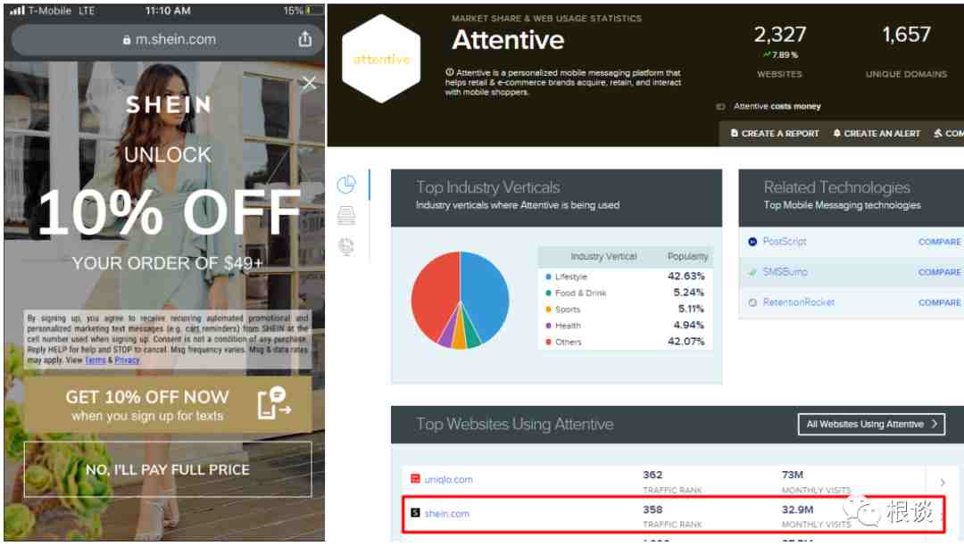 SHEIN通过与Attentive合作,在登陆页面做了一个收集用户手机号码用户发送营销短信,通过送折扣的方式引导用户去订阅短信,名义上是做购物提醒,实际上在黒五网一等大型购物节,通过发送海量促销短信,达到提高复购率的目的。