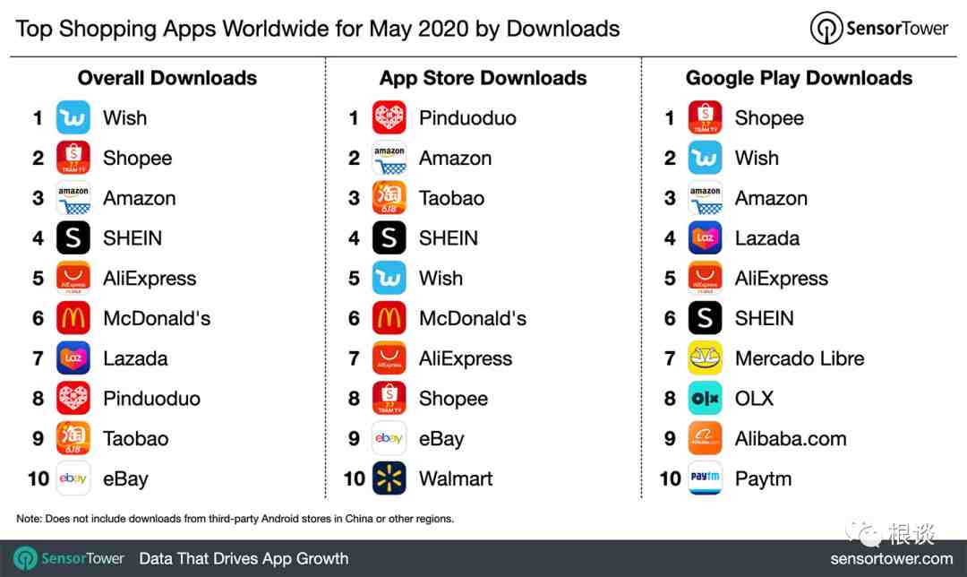 把所有用户装进一个APP是每个商家的梦想,随着移动互联网的普及以及智能手机的发展,整个互联网移动化趋势越来越明显。从公开资料来看,SHEIN也是很早就早布局移动端的。另外由于APP可以随时触达用户,可以提升用户的生命周期价值,很多品牌独立站都会开发APP,然后通过在广告渠道大量买量。就Sensortower的统计分析SHEIN 5月份在全球购物APP的排名:google play 第6名,APP store 第4名,全部下载榜第4名,且2020年7月份最新数据全球有600万的下载量。