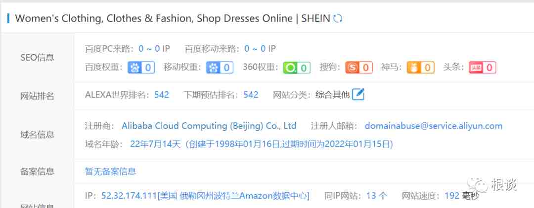 Shein.com前身是Sheinside.com,通过whois的查询来看注册于2011年,但是Shein.com这个域名首次注册于1998年,说明可能是在2015年左右从别人手上及时购买的,有消息说是花了一百多万RMB,无从可考,但是SHEIN确实简单好记,发音顺口,符合一个好的品牌应该有的名字,顾名思义,听起来就像一个女性时尚的品牌,唯一的缺点可能后期延伸男装产品线有一定的难度。这因此SHEIN的定位一直在时尚上面,没有像其他国内同行一样做成服饰电子综合平台类的站点,导致后期方向和用户画像不清晰。