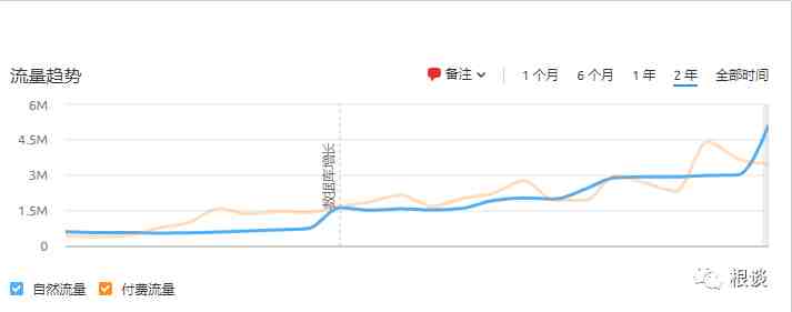 从SEMrush的数据来看:以她的主要市场美国为例:桌面端7月份的付费搜索流量为370万,自然搜索流量为301万(其中自然搜索中96.5%是品牌词流量,3.5%是非品牌词流量),付费搜索流量大于自然免费自然流量。从最近两年的趋势来看,自然流量和付费流量都呈现增长趋势