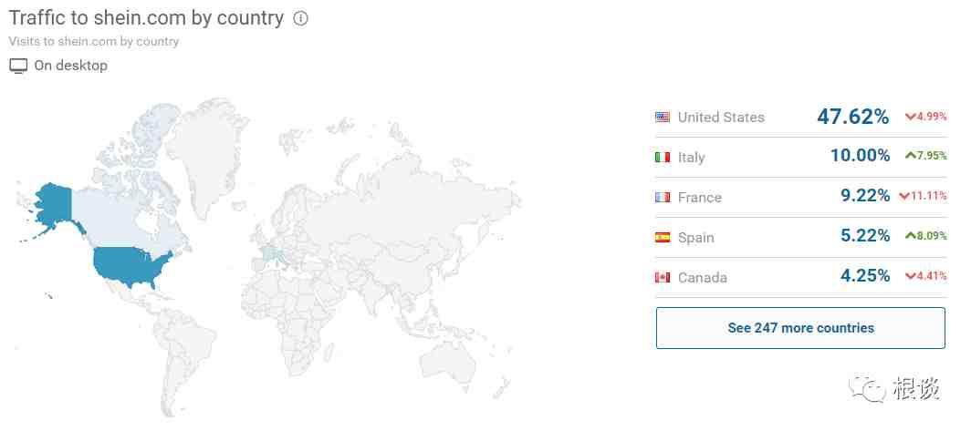 TOP 5国家 流量47%来自美国,10%来自意大利,9%来自法国,5%来自西班牙,4%来自加拿大,说明SHEIN的核心销售市场还是北美和欧洲,由于这些国家的电商成熟度高,也是目前跨境电商主要的市场,抢夺市场份额的竞争较为激烈。