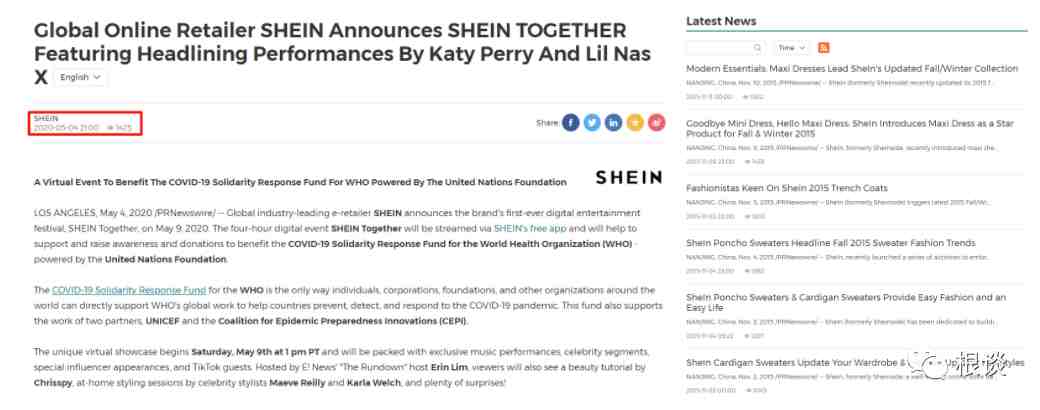 在美通社的网站上,最近的一篇PR是由SHEIN在5月份发布针对全球疫情做的数字娱乐活动SHEIN TOGETHER,邀请了很多独立音乐节,名人其中包括水果姐 Katy perry,说唱歌手 Lil Nas X进行的全球慈善直播活动,对于品牌升级塑造,再往前的PR是2015年前了,陆陆续续发布了30篇主要是关于新品上市的,检查了URL的参数有SEO的标识(?utm_source=PR&utm_medium=pr&utm_campaig=NR-SheInSEO20151112&url_from=NR-SheInSEO20151112),可能更多的是SEO部门为了做外链而发的。