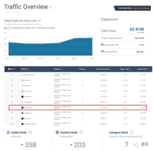 通过Similarweb的数据(2020年7月份)来看,网站月均流量在6千万(应该是PV),其中UV至少有4千万以上,意味着每天至少有100万的独立访客来网站。SHEIN全球排名358(Aleax :544),时装分类排名第7,排在优衣库和GAP的前面,互联网后浪有追赶前浪的趋势;网站跳出率不到40%,其中网站停留时间10分钟左右,平均每个访客浏览页面9个,间接可以说明其网站的内容吸引度和丰富度,由于SHEIN有快速上新的优势,海量的SKU让用户来SHEIN有点像逛街一样寻找时尚趋势和灵感,流量精准的情况下跳出率肯定很低。