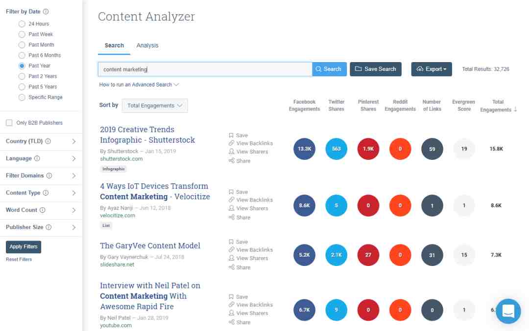 Buzzsumo是一款专注于内容的竞品监测工具。它可以查询任一关键词在社交媒体的热度,帮助内容创作者选题创作。同时,它还允许用户查看自己品牌或竞争对手相关主题下表现最佳的内容,也可以查看目前有多少人正在共享竞争对手的内容。