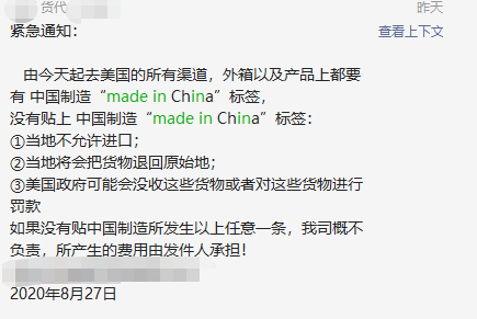 由于国际形势变化,美国各个渠道现要求所有从中国进口的货件都必须贴上“made in china”的标签,否则美国海关将不允许其进口,并且将不会进行任何通知的情况下把货物强制退回发货地。 也有可能会直接没收货物或对这些货物进行罚款。所有损失将由寄件方自己全额承担!