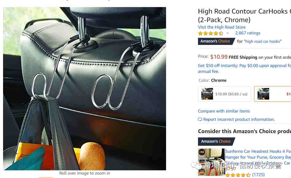 下面这款汽车座椅挂钩,目前它是亚马逊美国站的Amazon's Choice,留评2867,售价10.99美元: