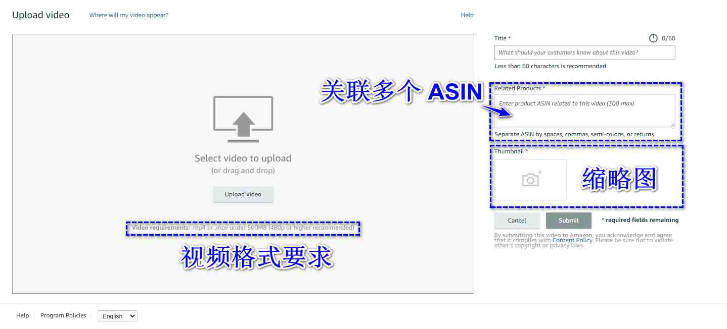 大小:500 MB 以下视频格式:.mp4 或.mov像素要求:480p视频上传成功之后,可以选择一键关联多个 ASIN,右下方可以看缩略图效果。