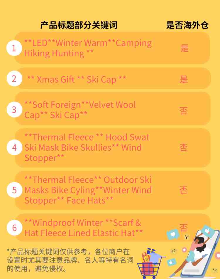 这些信息说明什么? 产品质量是热卖的基础,材质、特色功能、造型等都能让你的产品为用户提供额外的购物体验,帮助产品实现热卖。除了产品基本信息外,很多热卖的Beanie帽产品都会在产品标题中体现产品的特色材质、使用场景、节日等信息。