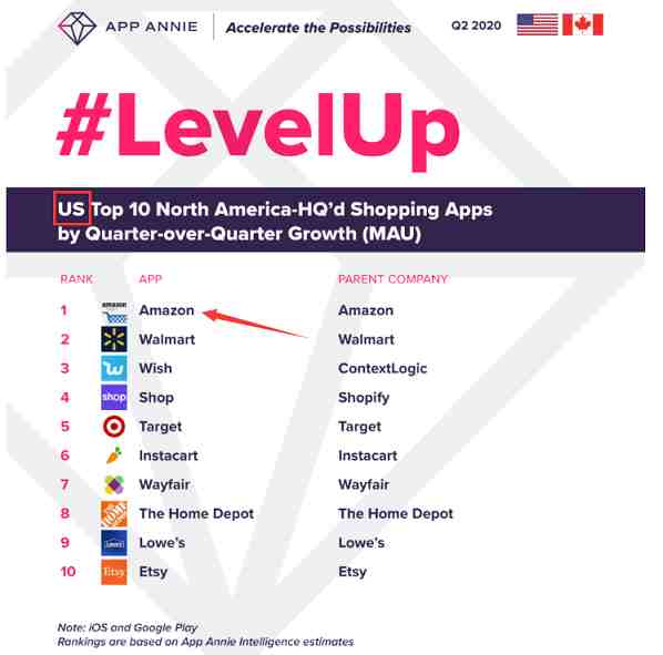 近日,在App Annie公布的北美今年第二季度按月活跃用户(MAU)增长排名前10位的购物应用程序中,亚马逊稳居榜首。