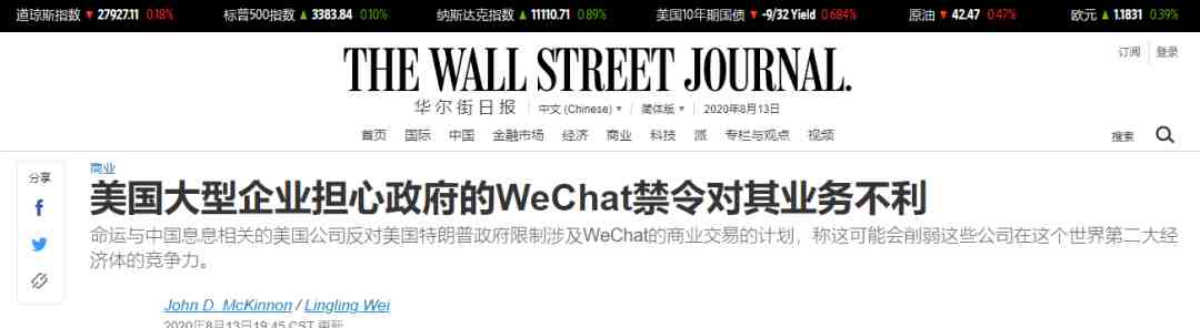 其中,苹果是美国市值最高的上市公司,高达近2万亿美元,沃尔玛、宝洁等市值超过3000亿美元;英特尔、默克等市值超过2000亿美元。粗略统计,上述公司的总市值合计超过3.5万亿美元。该行政命令于周四晚签署,明确阻止 "任何与微信有关的交易"。它将在几周内生效,但由于其宽泛的措辞,禁令的预期范围仍有很多困惑,这取决于美国商务部的意见。据《华尔街日报》报道,白宫与美国公司之间的通话,其中一个原因是这些公司试图在行政令的细节方面获得一些澄清。
