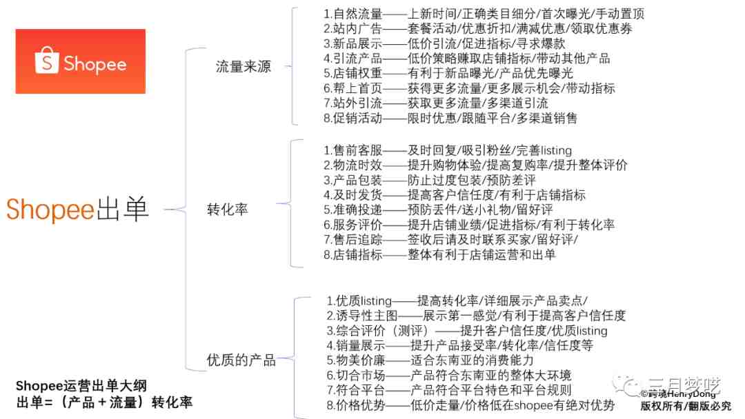 无论是做哪个平台,产品第一位,产品包含选品定价甚至于优质产品图片等,都是包含在产品内容里面一起的,这个是前提,如果你产品都展示的不好会极大程度降低客户的喜爱,第二个就是流量问题,也是大家最关心的问题,我给大家列出了流量来源的八个渠道,当然shopee平台远远不止这几个流量来源,shopee其实比较属于社交电商,所以粉丝经济是很有用的,当然前提是真人粉,而不是僵尸粉!最后一个就是我谈了几年的转化率问题,一定要研究转化率问题,才能订单最大化!