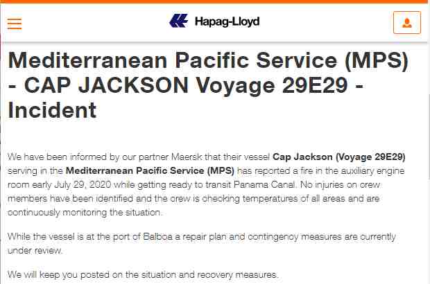 7月29日,马士基旗下一艘运力为4616 TEU名为"CAP JACKSON "集装箱船从墨西哥曼萨尼约抵达巴拿马巴尔博亚时,机舱突发火灾,导致一名船员受伤,一台发电机被完全烧毁。