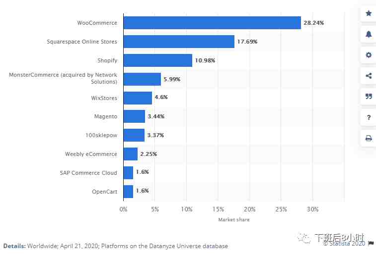 WooCommerce是2020年全球领先的电子商务软件平台,市场份额为28.24%
