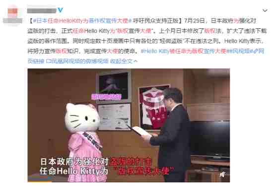 昨日,日本任命HelloKitty为版权宣传大使一事走红网络,并喜提热搜。据悉,日本在6月份修改了版权法,强化了对盗版的打击。此次任命大家所熟知的动画形象HelloKitty为版权宣传大使,也进一步的展现了打击盗版的决心。