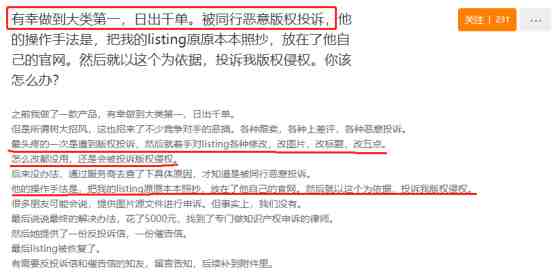 电商平台上的版权侵权维权可不至于此,要是listing有复制粘贴的嫌疑,也会被诉版权侵权。曾有卖家被竞争对手利用listing版权侵权一事摆了一道,险些葬送了大类第一、日出千单的辉煌时光。