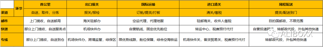 扯远了,接着说直邮,直邮的门槛相对较低,按照渠道可以分为“邮件,快递,专线”三个,如下图,整理了不同出口直邮方式的对比: