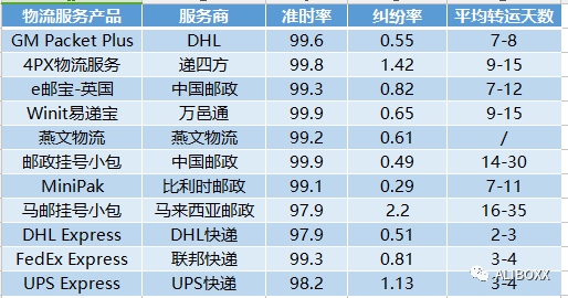 下图为ebay统计的2018第二季度各个物流商提供的物流服务产品时效: