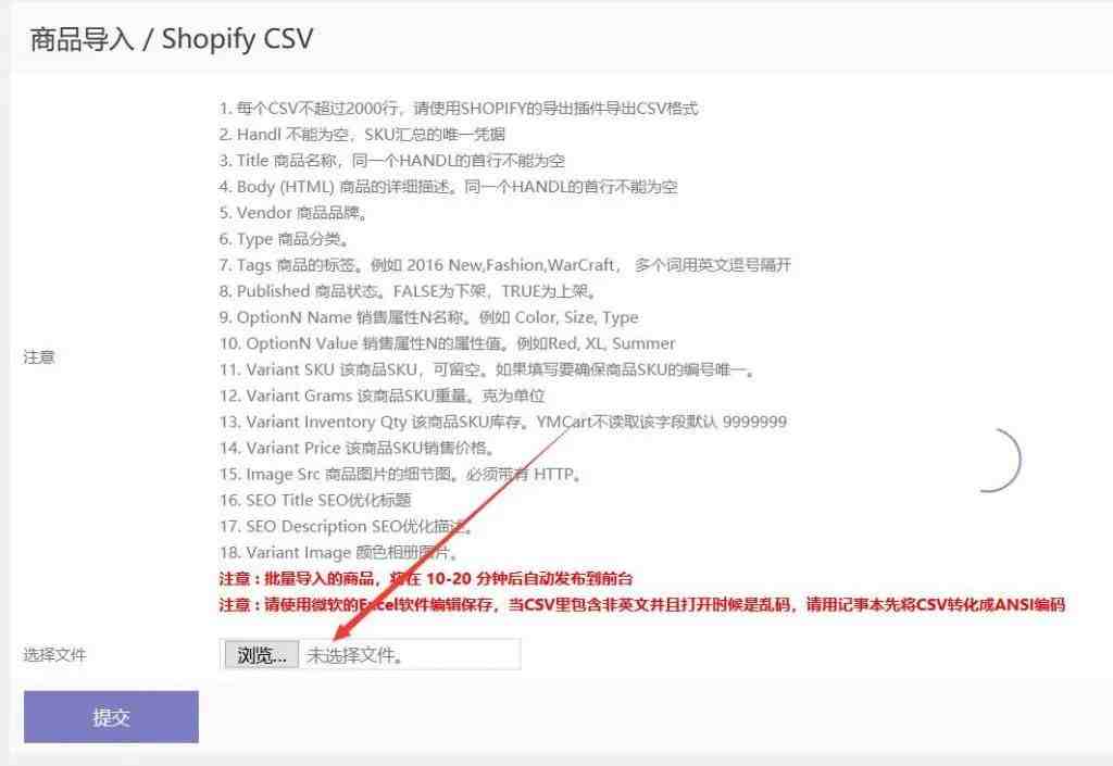 上图点击插件右侧的访问按钮,进入到导入页面,点击选择文件,浏览,找到你商品数据,可以直接导入到Shopyy。
