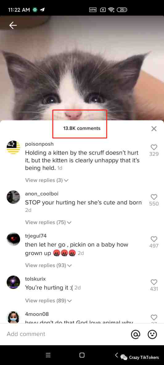 3. 话题讨论:因为视频中人抓着小猫的后脖子,所以在评论区,有人就开始讨论说,这样会弄疼它,不该这样抓着,小猫是太疼了。而另外有一帮人则说,母猫都是这样抓小猫的,所以,这是正确的方式。激烈的讨论,关注的话题度,也是视频爆的原因。截止目前,视频的评论,已经达到了13.8K。