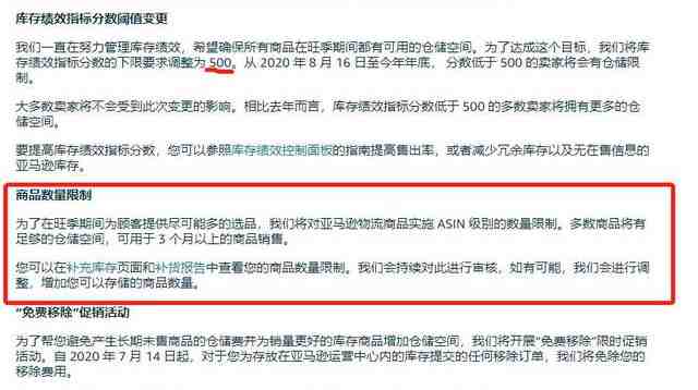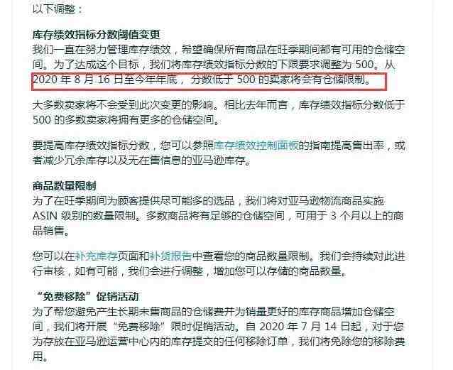 平台一直在努力管理库存绩效,希望确保所有商品在旺季期间都有可用的仓储空间。为了达成这个目标,平台将库存绩效指标分数的下限要求调整为 500。从 2020 年 8 月 16 日至今年年底, 分数低于 500 的卖家将会有仓储限制。