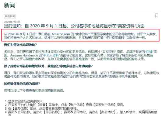 昨天,亚马逊发布一项新政策:“自 2020 年 9 月 1 日起,公司名称和地址将显示在“卖家资料”页面”,对于个人卖家,亚马逊将显示个人姓名和地址。