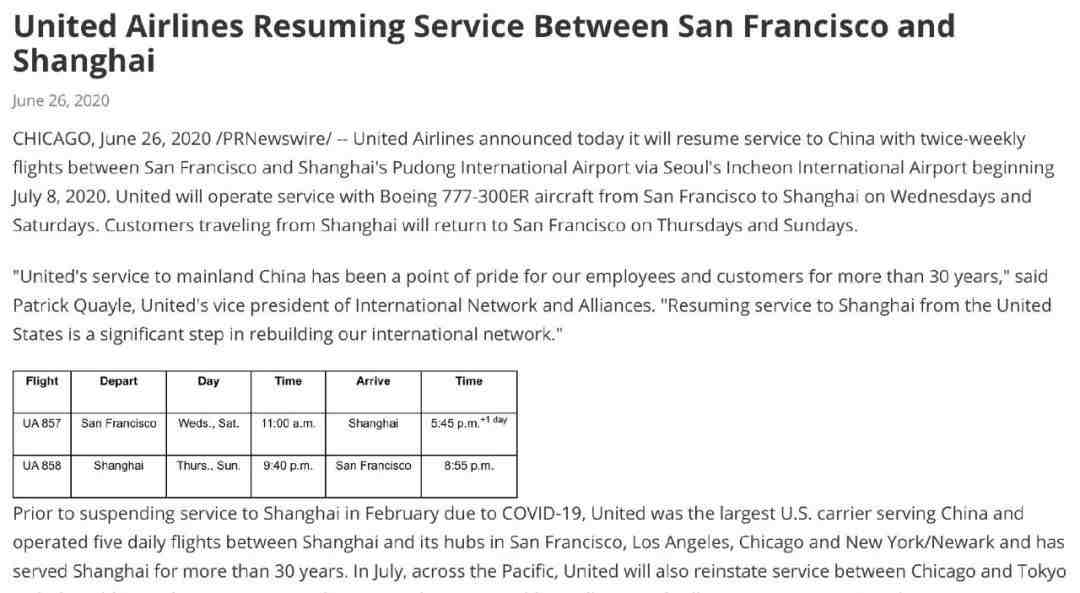 从7月开始,达美航空将加线运营西雅图-上海浦东(航班号DL287)、底特律-上海浦东(航班号DL283)两条航线,每周各运营一班。需要注意的是,按照达美航空公布的航班计划,6月25日起西雅图-上海浦东每周运营的两个班次,中间需要经停首尔仁川机场。从7月开始,每周运营一班的西雅图-上海浦东、底特律-上海浦东航线,同样经停仁川机场。可以通过达美航空官网、Fly Delta应用程序、票务代理等渠道订票。6月26日美东时间周五,美联航也紧接着公布复航中国上海的消息。根据官网,美国联合航空公司将于2020年7月8日恢复旧金山和上海之间每周两次的直飞航班。该航线将升级机型,使用波音777-300ER飞机,且均在首尔仁川经停,运行时间如下: 旧金山SFO -上海PVG UA857 每周三和周六:旧金山 11:00 - 15:10+1 首尔 16:55+1 - 17:45上海 上海PVG - 旧金山SFO UA858 每周四和周日: 上海 21:40 - 00:25+1 首尔 02:10+1 - 20:55 旧金山当然,和以前一样,中美之间的旅行仍然受到严格限制,所以不是每个人都能乘坐这些航班。据大韩航空官网,自6月23日至6月30日,将保留仁川-沈阳航班,航班号KE831/832,每周1班,周五执飞;保留仁川-香港航班,航班号KE607/608,每周3班,KE607每周二、四、六执飞,KE608每周三、五、日运营;保留仁川-台北航班,航班号KE691/692,每周4班,每周二、三、五、六运营。