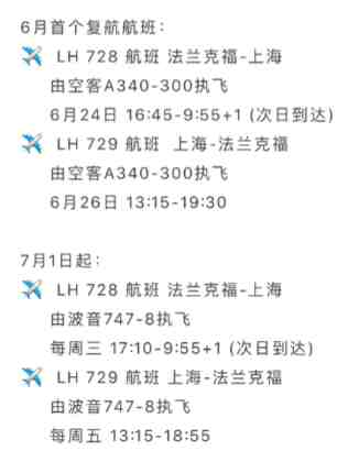 首个复飞航班将于6月24日当地时间18:05从德国法兰克福起飞,并于次日11:55到达上海浦东国际机场。首个从中国出发的航班将于6月26日13:15从上海浦东国际机场出发,并于当天晚间到达德国法兰克福。6月24日,维珍航空宣布,将于8月4日恢复伦敦-上海航线,每周一班。