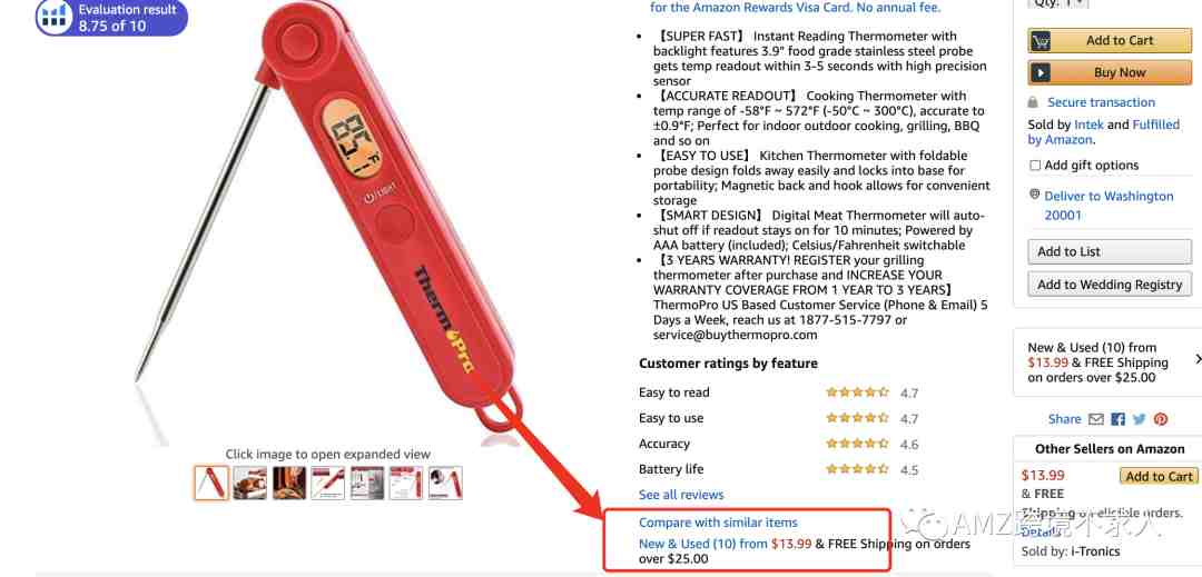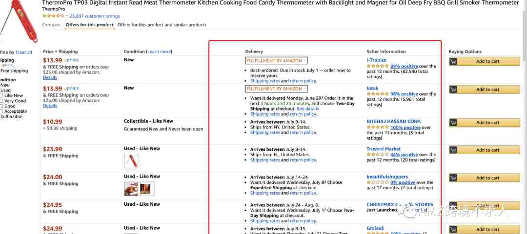 在上图,亚马逊出售的办公用品位于黄金购物车(Buybox),而在右下角“OtherSellers on Amazon”就是其它跟卖的卖家,他们也在出售同款产品,如果点击“10new”,可以看到所有的跟卖卖家,以及各个跟卖卖家的产品价格、运费、配送物流信息。