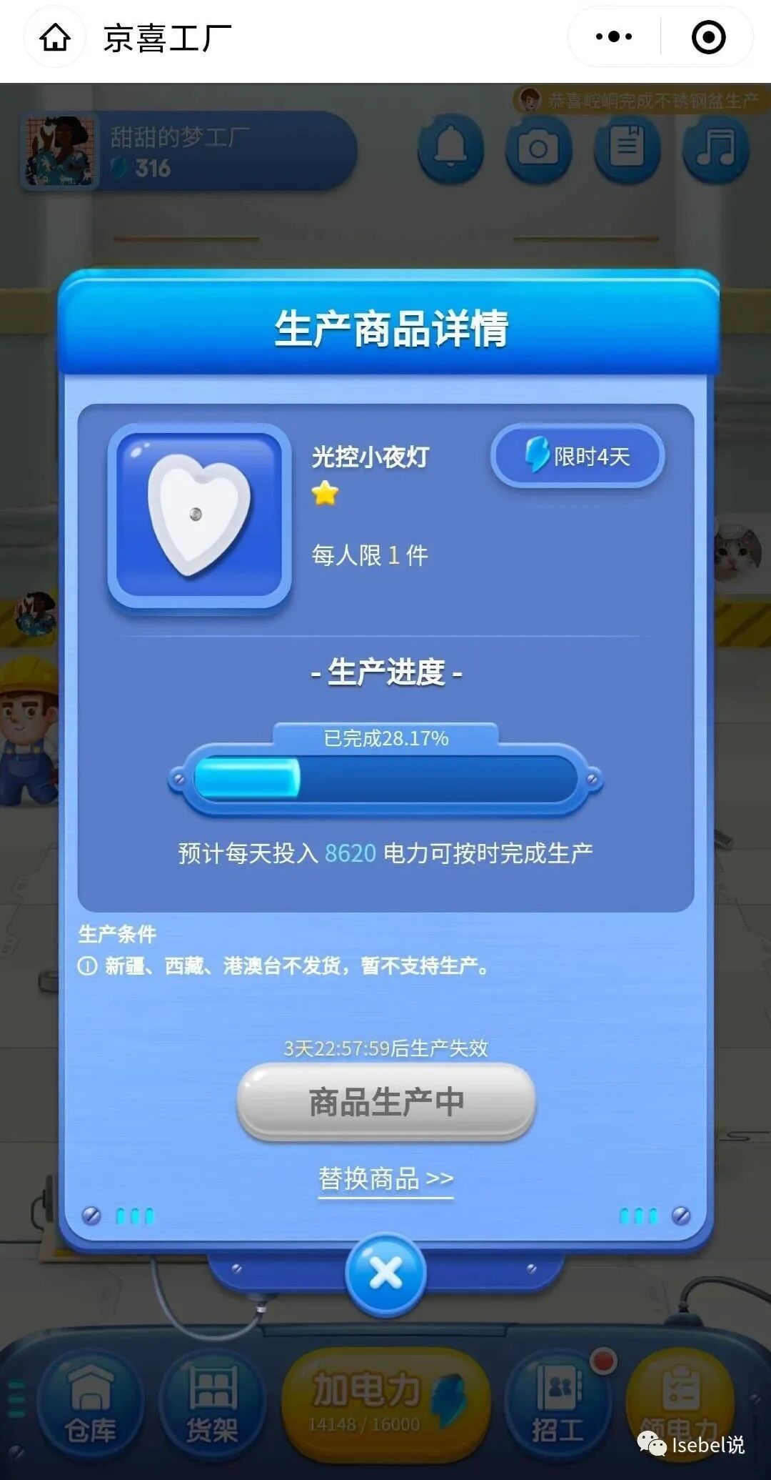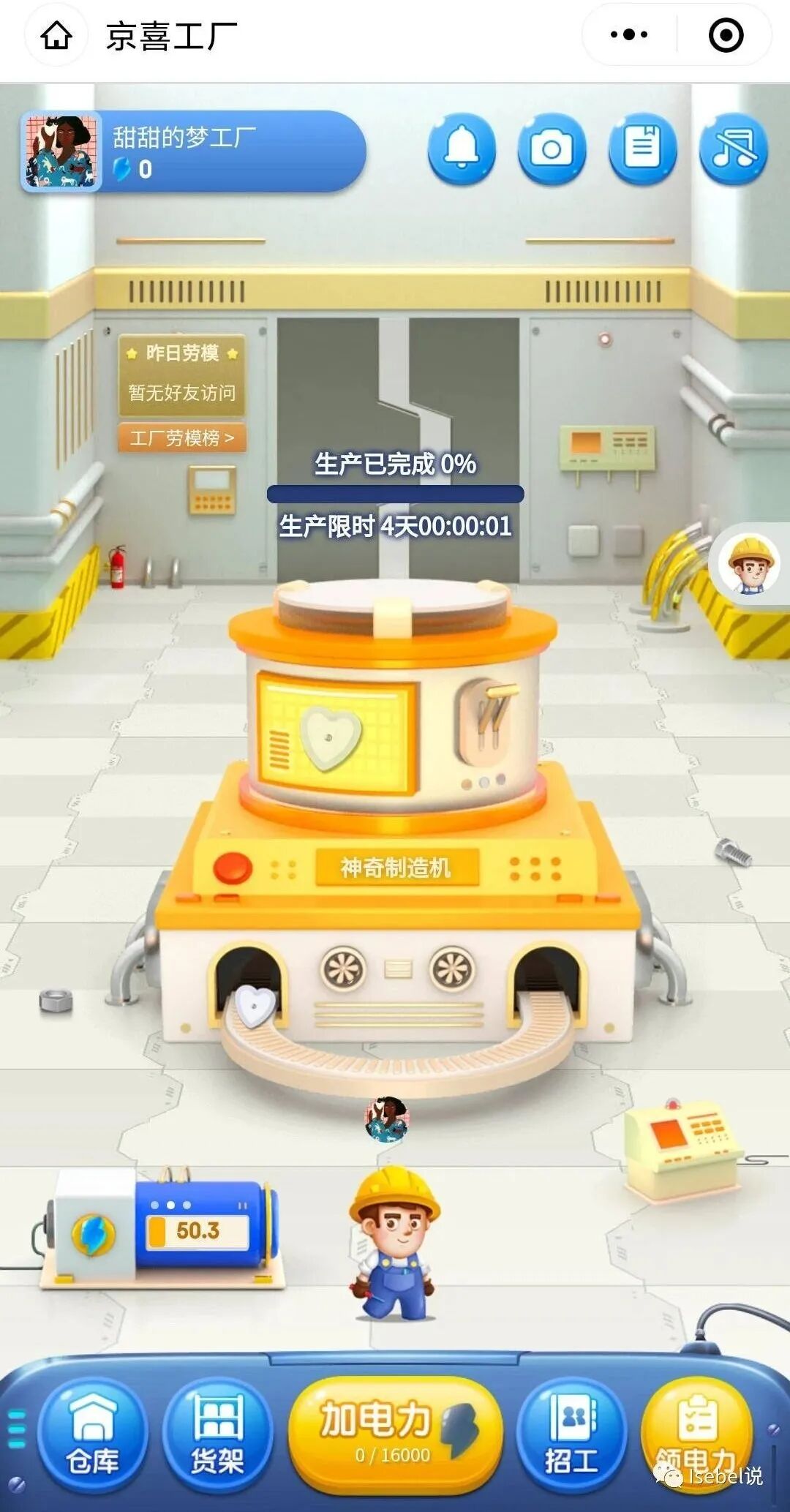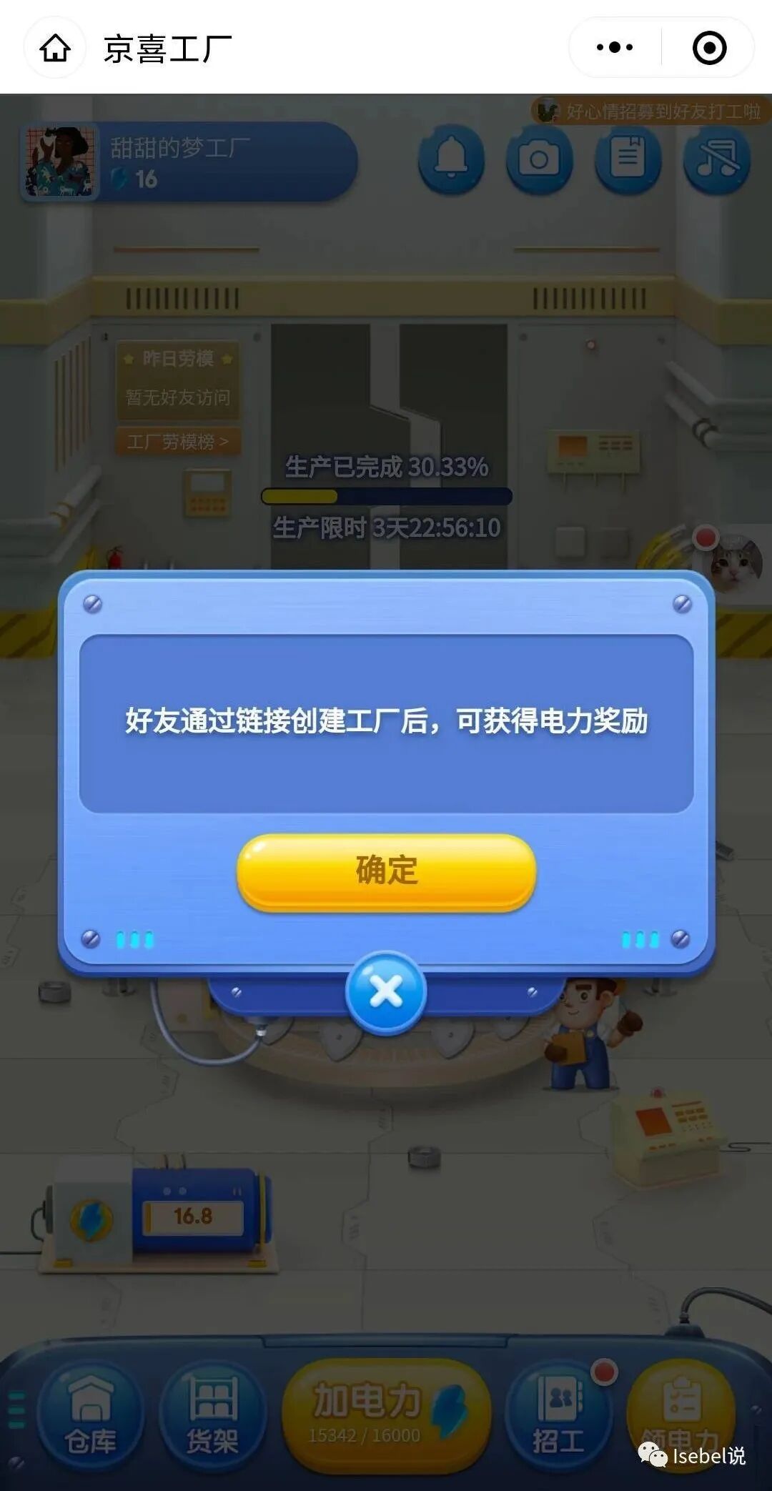- 该活动足够吸引用户,用户可以随意选择自己想要去生产的商品进行生产,可以通过游戏化的玩法来获得电力,趣味性又简单操作。类似积分会员的和学习型社区也可以使用这种方式进行社区的留存活跃,以及产品拉新。同时叠加好友助力,签到打卡等玩法。