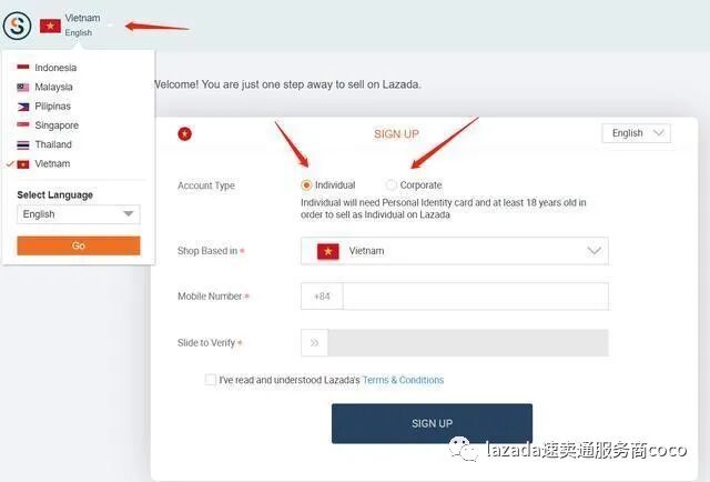 (4)点击“SIGN UP”,选择要注册的国家,填写相关信息:可以选择个人还是公司(区别于跨境店铺只能公司注册)